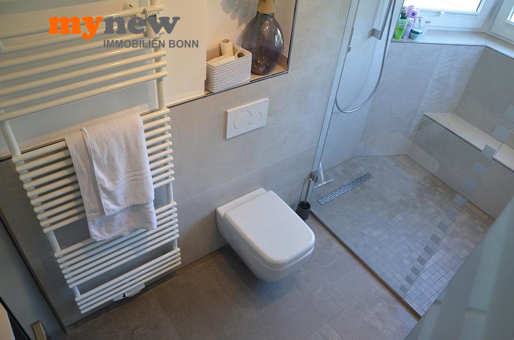 Über den Flur mit Einbauschrank gelangt man in das großzügig geschnittene Wohnzimmer mit offener Küche und überdachtem Balkon, sowie in das komplett neue, lichtdurchflutete Duschbad. Das Bad, als Highlight dieser Einheit, verfügt über eine große, offene Regendusche inkl. großer Sitzgelegenheit, einer Handtuchhalterheizung, einem großen Waschtisch, WC und Fenster.