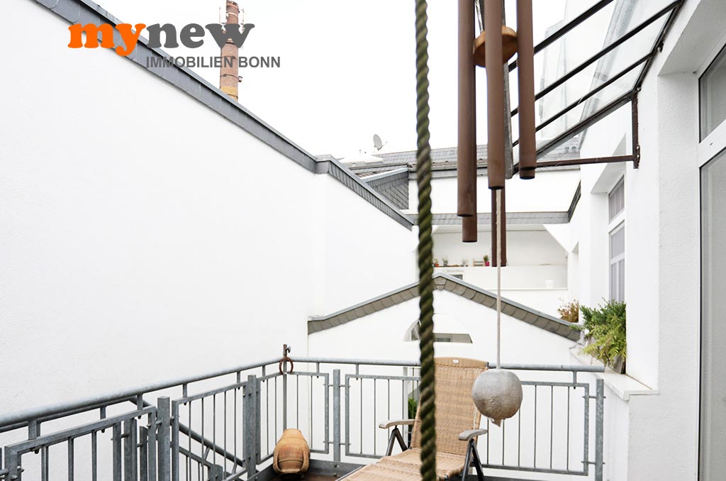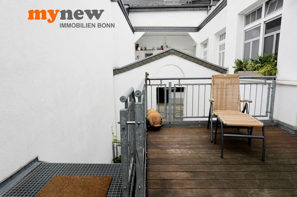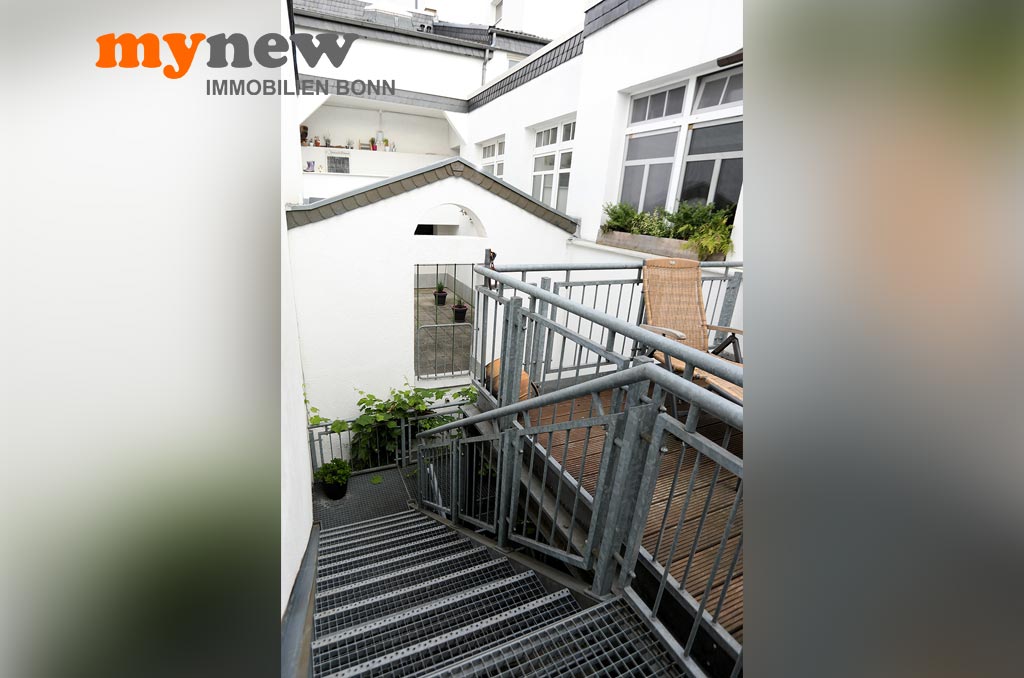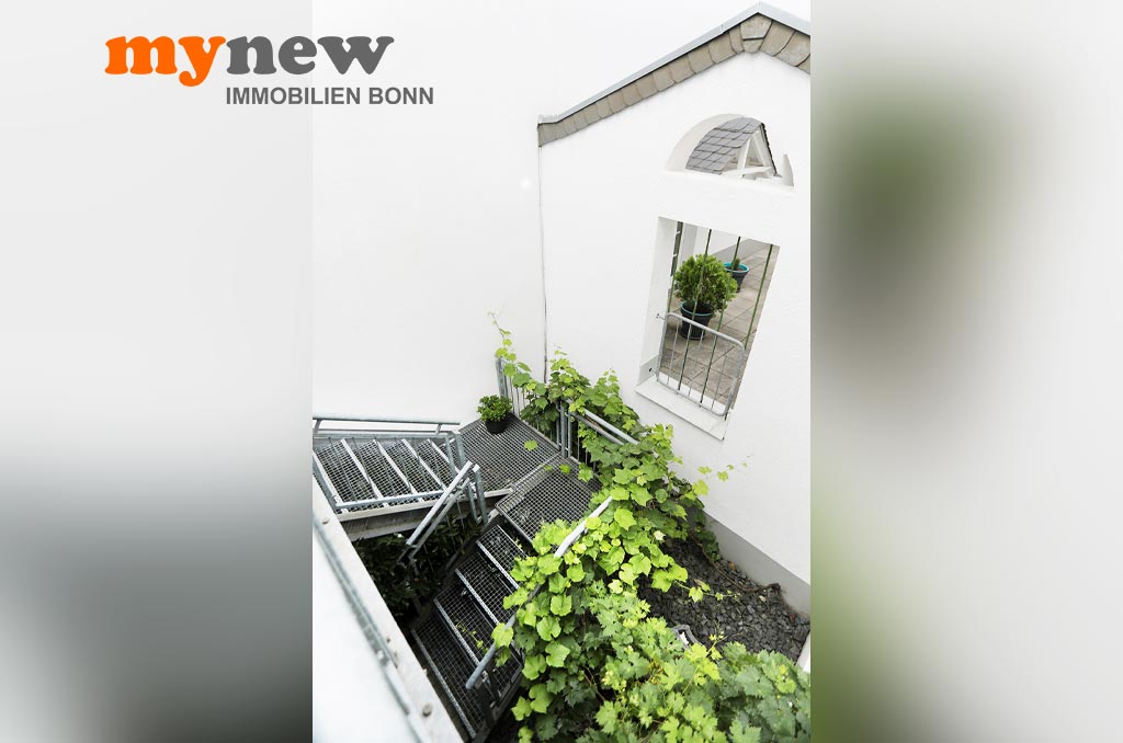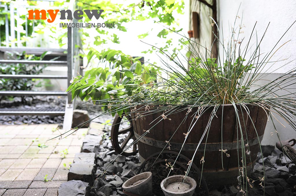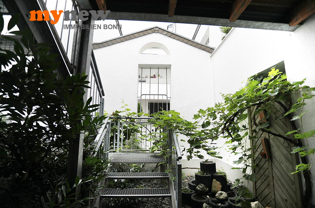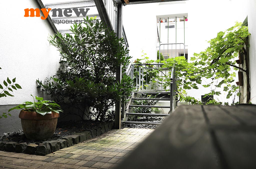 Diese ungewöhnliche Zweizimmerwohnung befindet sich im Komplex der im Jahr 2000 revitalisierten Germania Brauerei im Herzen von Bornheim-Hersel. Versteckt mitten in der verwinkelten Liegenschaft, welche Moderne mit altem Industrieflair verbindet, findet sich diese ganz besondere Eigentumswohnung. Gleich nach dem Zugang über eine Holz-Gartentür ist man irgendwie im Urlaubsmodus. Alles wirkt gleich einladend, so wie ein mediterraner Hinterhof, mit viel Liebe zum Detail. Der Bereich bietet viel wertvolle Nutzfläche für viele Zwecke. Im Zweifel steht hier einfach das Fahrrad sicher, oder man nutzt den Platz zum Grillen. Von hier aus führt dann eine Treppe nach oben über die Terrasse zur Wohnungstür. Durch den eigenen Zugang hat man eher ein ‚eigenes Reich-Gefühl‘, als bei einem typischen Mehrfamilienhaus. Wenn man will, wird man hier kaum gefunden und genießt eine herrliche Privatsphäre.